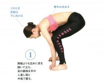 1 肩幅よりも広めに足を開いて立ち、足の親指を手の人差し指と中指で握る。