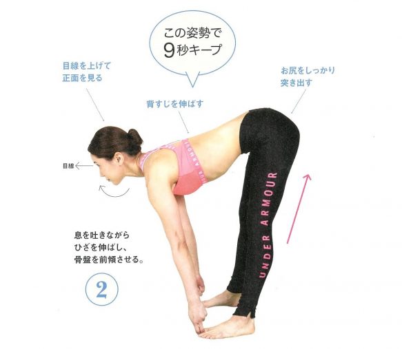 2 息を吐きながらひざを伸ばし、骨盤を前傾させる。