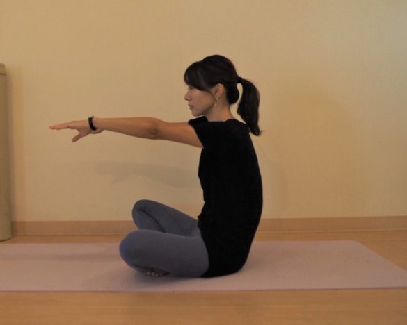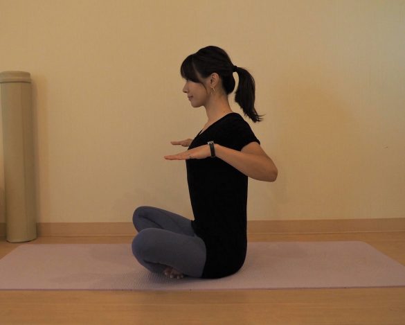 1 両腕を肩の高さで体の前に伸ばし、背中を“やや”丸める~10秒キープ