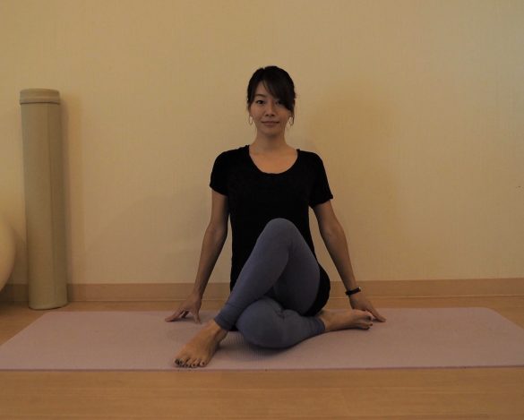 1 床に座り、右ひざが下、左ひざが上になるように足をクロスする