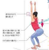 手のひら、胸を壁から離さず、息を吐きながら、ぐっとお尻を突きだすイメージで、ゆっくり腰を落としていきます。限界まで下げたら、ゆっくり元の姿勢に戻します。これを10回繰り返します。