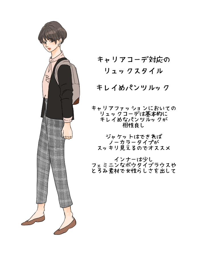 もう一点、忘れてはならないのがリュックのデザイン。コーデがどんなに上品で完璧なスタイルだったとしても、リュックのデザインがカジュアルでは通勤ファッションには向きません。