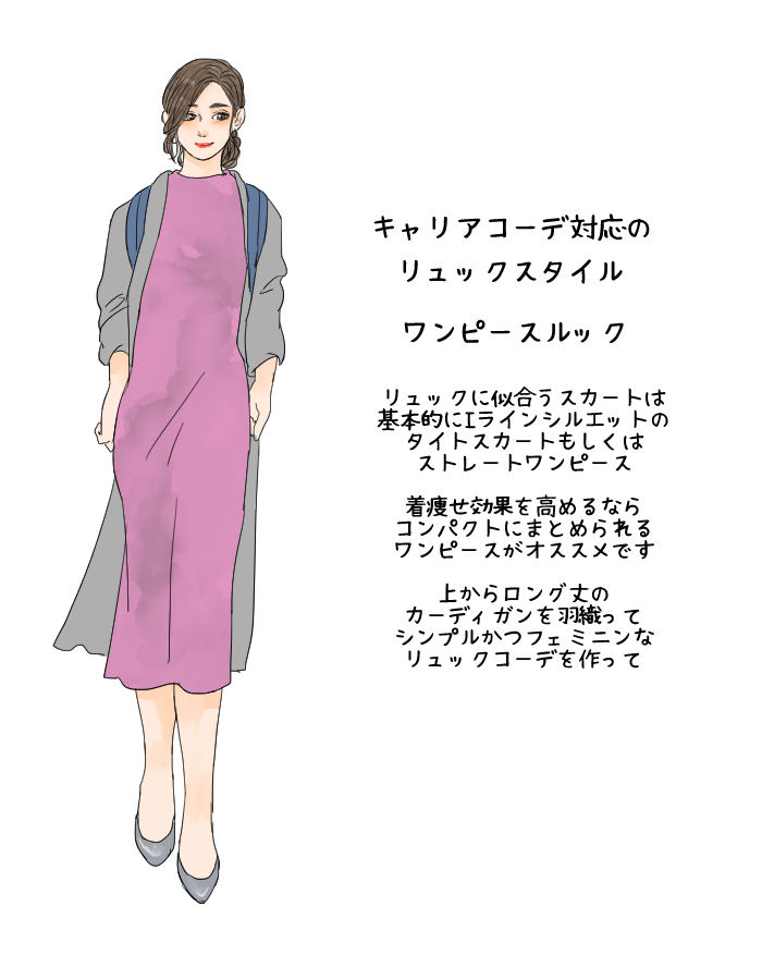 ワンピースの上にロング丈のカーディガン、もしくはノーカラーコートをさらっと羽織って、コーデの完成度を高めれば上品な通勤リュックコーデの完成です。