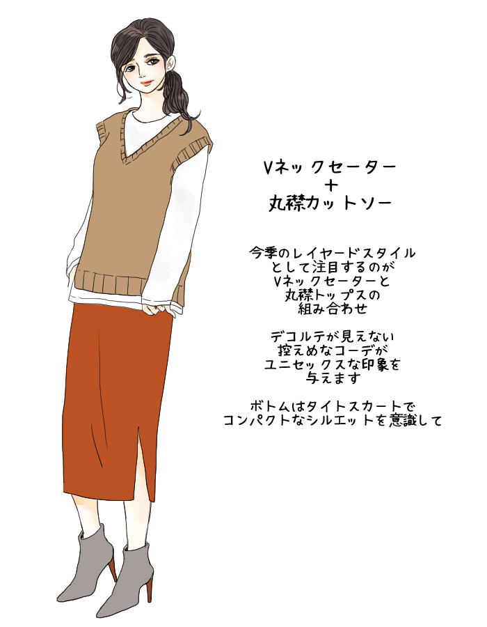 これまでは、Vネックセーターのインナーは同じくVネックのインナーか、デコルテが見えるほど大きく襟があいたラウンドネックが基本の重ね着でした。しかし、ここ数年はあえてデコルテラインを見せない丸首やハイネック志向が強くVネックにあえて丸首のカットソーを組み合わせたユニセックススタイルが支持されています。
