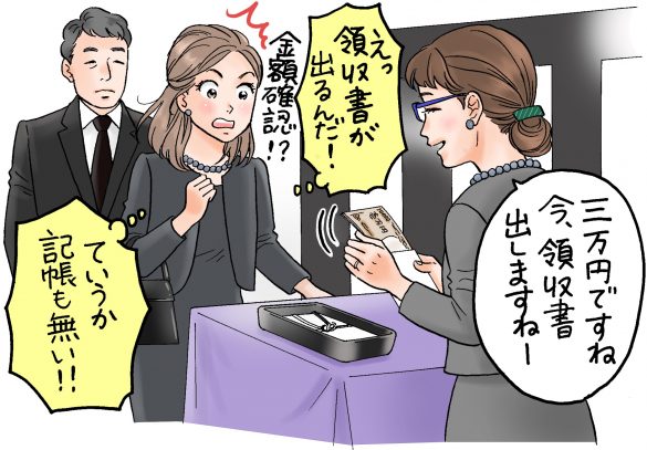 「受付での記帳がないことにまずビックリしました。でも、それ以上に驚いたのは、香典袋を渡したら、その場で袋から包んだお金を出して確認し、領収書を渡されたんです。まさか領収書がもらえるなんて思っていませんから頭の中はクエスチョンマークでいっぱいでした」