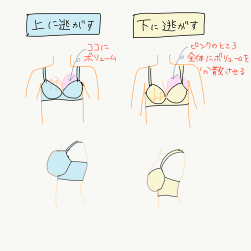 谷間の場合、脇から寄せてきたボリュームを潰して、谷間を作ることで小さく見えます。上に逃がす場合はデコルテ方面にボリュームを、下に逃がす場合は胸の付け根からブラジャーのアンダー方面にかけて全体に平ぺったくボリュームを分散させるイメージです。