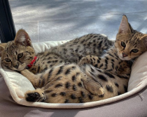 ジャスティンがインスタグラムに開設したスシ&ツナ用の特別アカウント「kittysushiandtuna」には愛らしい2匹の日常の風景がたくさんアップされている。昨年から飼っているという犬のオリバーとも仲睦まじい様子で、見ていて思わず微笑んでしまう。  すでに31万7千人のフォロワーを持つこの人気アカウントには、「ツナとスシは、F1のサバンナキャットのきょうだい。当アカウントは(彼らの)パパであるジャスティン・ビーバーが運営」と記されている。  サバンナキャットというのは、アフリカの野生猫サーバルキャットとイエネコの交配種。ツナとスシは“F1”のサバンナキャットとされているが、F1というのはもっとも野生に近い品種ゆえ、ペットとして飼育するのは非常にまれだそう。  体重25ポンド(約12キロ)にもなるというこの動物については、飼育が禁止されているところもあるという。サバンナキャット協会によると、アメリカではいくつかの州で法的に制限を設けているものの、イリノイ州やテネシー州、サウス・カロライナ州、カリフォルニア州では許可されているようだ。ジャスティンは、挙式する前にイリノイ州のブリーダーから購入したものとみられている。
