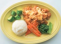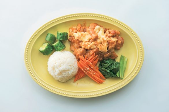 メインのおかずをチンして完成させ、ご飯とキュウリの浅漬け、ミニトマトを添えるだけで、カフェ風ワンプレートに。カレー味のキャロットラペも彩りに加えるとさらに本格的。