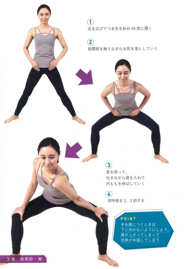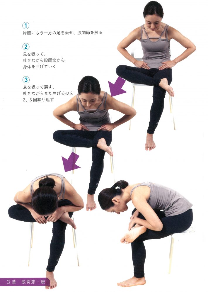こちらも椅子さえあれば、いつでもどこでもチャレンジ可能。私、仕事の合間にやってみましたが、腰からお尻がいい具合に伸びて、身体がシャキッと目覚めました。若干痛みを伴いますが、いわゆる痛気持ちいい感覚です。忘れてはいけないのが、股関節を触ること。ここを意識するだけで、結果が違ってくると思います。