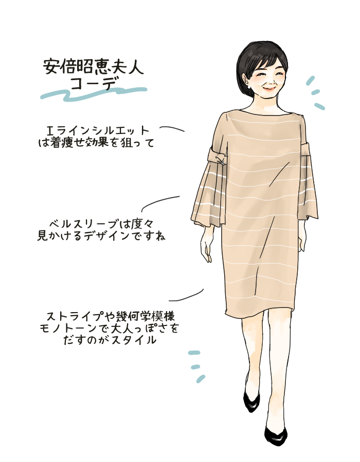昭恵夫人の世代がひざ丈のワンピースを着るとどうしても、若作り感のある痛いファッションになりがち。ですが昭恵夫人はあえて可愛らしい色合いを使わずにモードテイストに仕上げることで、大人の洗練されたワンピーススタイルを表現していますね。