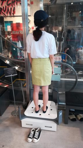 11月中旬現在、3Dスキャンができるのは、札幌、原宿、銀座、六本木、お台場、名古屋、大阪(心斎橋)、グランフロント大阪、京都藤井大丸の9店舗。 ニューバランス「3Dスキャン」 原宿店へ行ってみたところ、外は若者と海外旅行者で賑わう中、お昼時だからか意外と静かな店内。そして、エスカレーターの横にひっそりと置かれている台。 ニューバランス「3Dスキャン」 体験している人も、スタッフも周りに誰もいなかったので、少し不安になりつつも、看板の「ぜひお気軽にスタッフにお声掛けください」の言葉を信じ、恐る恐る近くにいたお兄さんに頼んでみました。 ニューバランス「3Dスキャン」 すると当たり前ながら、慣れた手つきで測定を進めてくれるお兄さん。靴を脱いで3Dスキャンの台に上がってから、靴を履いて説明を聞く態勢に入るまで1分もかからないほど、測定はあっという間に終わりました。