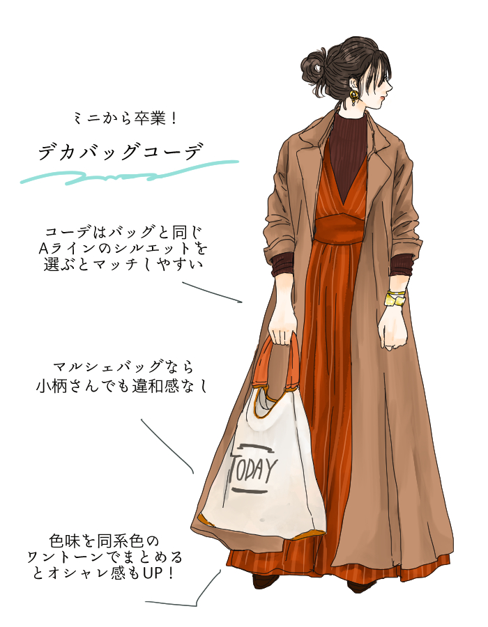 もう一点、オススメのデカバッグはマルシェバッグ。トートタイプと違い、バッグが自立していないので大きくても、悪目立ちしにくいです。大きなバッグに慣れていない方はマルシェバッグから慣らしていくと良さそうですね。