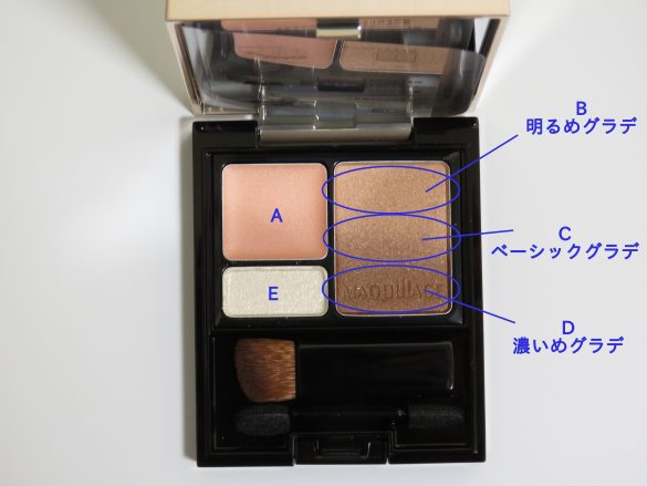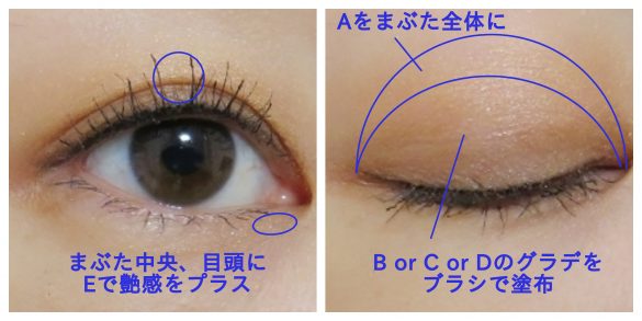 まずは左上のクリアベースAをまぶた全体に塗ってくすみを飛ばし、B~Cのグラデをブラシで塗ります。最後に、Eのラメをまぶた中央や目頭に塗って、立体感や華やかさをプラス。
