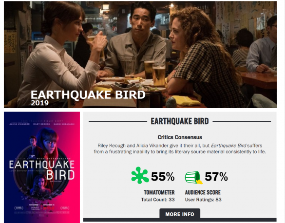 と、ここまでは素晴らしいのですが、問題は海外メディアや批評家の反応。通常、作品のリリース時には新聞各紙やエンターテインメント誌にレビューが掲載されますが、そのどれもがイマイチとぶった斬るものばかり。 有名批評家からは軒並み、「あいまいで分かりにくい」「不完全」「説得力に欠ける」「絶望的にダルい!」とさんざんな言われようで、いつもは“日本モノ”に好意的な『ジャパンタイムス Japan Times』の記者さえもが「ストーリーを省略し過ぎだし、重要なシーンは雑に扱われている」と辛口コメントでした。 アメリカ最大の映画批評サイト「ロッテン・トマト Rotten Tomato」では肯定的なレビューが75%以上になるとフレッシュ認定、59%以下だと腐った緑のトマトと判断されますが、『アースクエイクバード』は批評家53%、オーディエンス58%とともに低評価。 一方、10月に開催された東京国際映画祭で特別招待作品として上映されたNetflixオリジナル映画、という2つの共通点を持つ『マリッジ・ストーリー』(12月6日配信開始)の「ロッテン・トマト」評価は、批評家96%、オーディエンス91%とその差は歴然。 レビューを書いている批評家数も『マリッジ・ストーリー』の199に対し、『アースクエイクバード』は32と少なく、そもそも作品自体の注目度が他作品に比べて低いことが分かります。