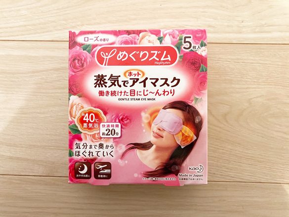 あったかグッズの代表的存在とも言える、めぐりズムのアイマスク。約40℃の心地よい蒸気が疲れた目元をじんわりとほぐしてくれる癒しアイテムです。筆者がセレクトしたのはローズの香りですが、他にもカモミールやラベンダー、完熟ゆずの香りなどもあります。5枚入りで500円ほどでした。