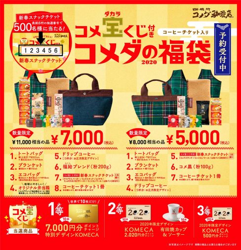 コメダ珈琲の福袋にはコーヒーチケット・スナッククーポンの金券に加え、ドリップコーヒーやトートバックなどのオリジナルグッズが入っています。コメダ珈琲のすごいところはコーヒーチケットに利用期限がついていないので、確実に使い切ることができるところです。