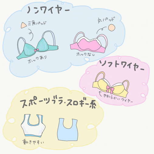 ワイヤーが入っておらず、つけ心地が楽です。カップ(ブラジャー本体の中に入っているパッドのようなもの)の形が、丸や三角などいろいろあります。ものによってフィット感も変わってくるので試着をして確かめてみてください! ホックがついていて、ブラジャーをつける感覚を掴めるものがおすすめです。もちろんかぶるタイプでも問題ありません。