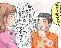 実家で過ごした夫は、帰ってくるときまって、実家でのことをかたっぱしからアキさんに聞かせます。両親と話したこと、両親と見たテレビ、両親と食べたごはんのことなど、とにかく実家のことばかり。