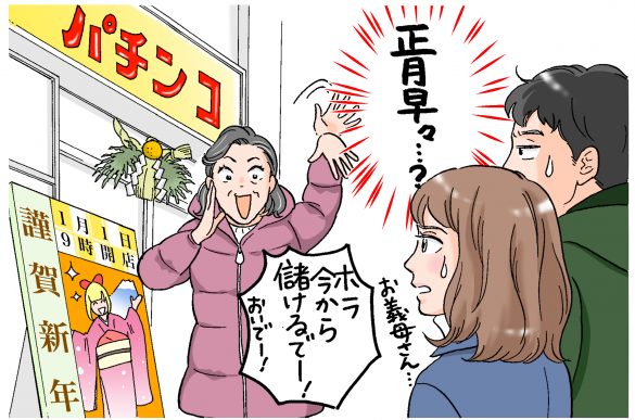 「お義母さんはとても歓迎してくれたのですが、着くなり、『今からいいところに行こう』と外出。なんと、向かった先はパチ屋(パチンコ・パチスロ店)だったんです。夫からお義母さんがギャンブル好きだとは聞いていましたが、まさか新年から行くほど好きだとは思っていませんでした。  私も夫も、ギャンブルはまったくやりません。だから、パチ屋にいても退屈なだけで。義母はさっぱり儲からなかったようで、『台を変えた途端、次に座ったやつが大当たりしてて、腹立つわ~』などと、くだらない愚痴を言っていました」 義実家へ帰省して向かった場所は… この時点で、「意地悪されるよりはマシだけど、なんだか思ってた帰省と違う……」と違和感を抱いたという香織さん。さらに驚きの出来事が続きます。