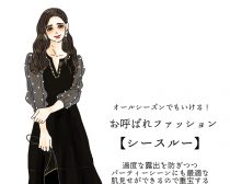 そこでよく取り入れるのは鉄板ですが、“シースルー素材”であしらわれたドレスワンピース。直接的な肌見せは露出を強調させるし、肌のお手入れもめんどくさいし、何より寒い…。それにもし予想よりカジュアルめのパーティーだった場合、肌を多めに露出していると場違いな印象を生みかねません。