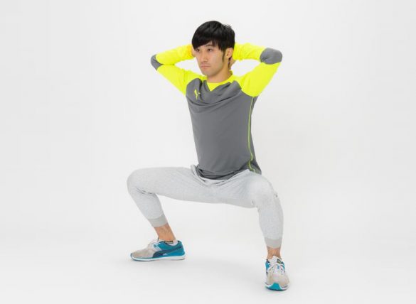3. 膝とお尻の高さが揃うところを限界とし、自分の下がれる高さまでお尻を落としたらこの体勢を5~10秒キープする。