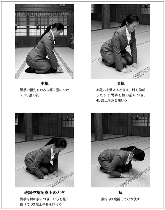 敬礼の作法には、拝と揖などがあります。拝は最も敬意を表す動作で、腰を90度折ってひれ伏します。揖は拝に次ぎ、45度腰を折る深揖(しんゆう)と15度腰を折る小揖があります。お祓いを受けるときには、深揖の姿勢をとります。