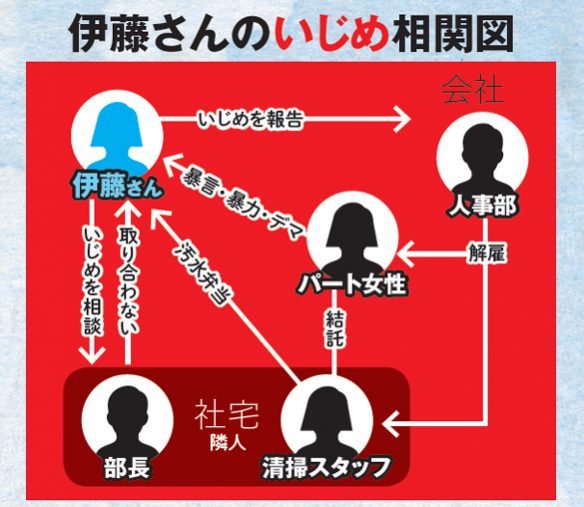 ・’15年4月/入社直後から標的に 長年働く女性2人から「気に入らない」といじめがスタート ・’15年4~12月/「トイレの汚水入り弁当」事件 清掃スタッフから弁当にトイレの汚水を混入され、5回もノロウイルスに感染する異常事態に ・’16年7月/暴言・デマ・暴力が激化 パートの女性からの怒鳴る、殴る、デマを言いふらすなどのいじめが一層エスカレートする ・’18年9月/本社に告発 写真、動画、音声、されたことのメモなど証拠をそろえて本社の人事部に提出。首謀者は解雇されたが伊藤さんも精神を病み、退職に追い込まれる ― 大人のイジメ地獄 ― <取材・文/週刊SPA!編集部>