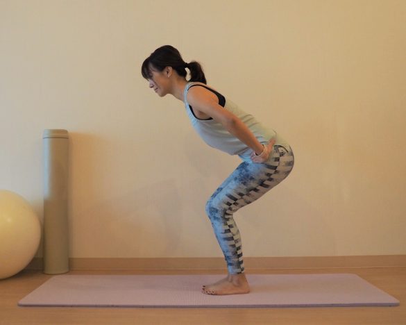 2. 両手を腰に添えてひざを曲げ、腰を落とす