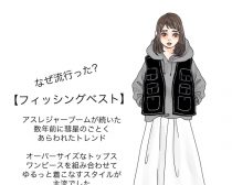 アウトドアが行きすぎた「フィッシングベスト」 2018年頃から、突如現れたトレンドアイテムのフィッシングベスト。もとはメンズのトレンドファッションとして注目されました。ちょうどこの頃は、スポーティなアイテムに加えアスレジャーアイテムへの支持がかなり高まっていましたね。フィッシングベストをちょっとモードに着こなすスタイルがウケて、それが女性ファッションの間でも流行していったという経緯があります。  フィッシングベストという難易度の高いアイテムだからこそ、オシャレ上級者がこぞって挑戦的にスタイリングを試みたのではないでしょうか。当時はワンピースやゆるっとしたTシャツ、パーカーにワイドボトムを組み合わせた古着ミックスな着こなし方が主流でした。2020年ではもう街中でもほぼ見かけないので、早々にトレンド終了の兆しです。