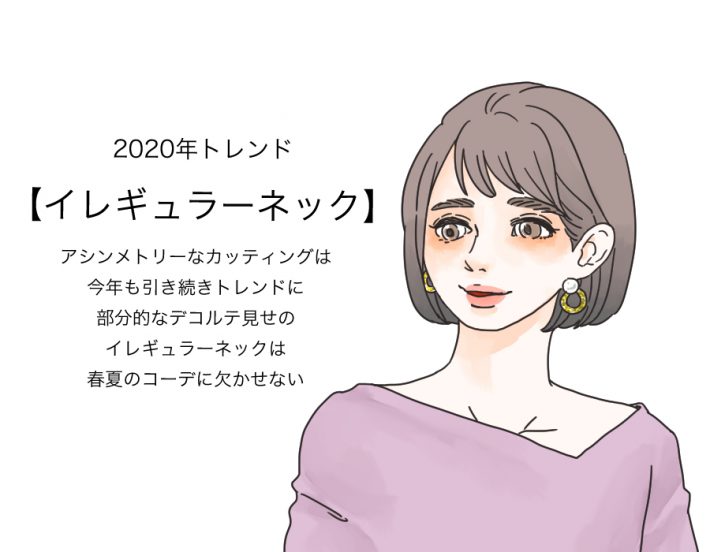 2019年の秋から目に見えて登場し始めたのが「イレギュラーネックのカットソー」。イレギュラーネックとは、左右非対称の不規則な形をしたネックラインのことを指します。もちろん、カットソーに限らず昨年からはワンショルダーのワンピースやジャンパースカートが非常に多く展開されているので、2020年の春夏もそれを引き継いでいくことになりそうです。