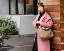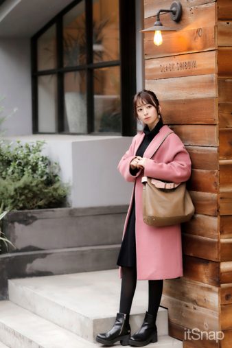 「“女子会コーデ”がテーマの着こなしなんですが、なんと言っても淡いピンクの色味に一目惚れしたノーカラーコート(JEANASIS)が一押しアイテム。それにブラックニットワンピ(Noela)を合わせてレイヤードしました。このワンピはソデにパールが付いていて、一枚でも映えるアイテム。ショートブーツもコートと同じ、JEANASISで購入! トートバッグ(IANNE)はピンクのベルトがアクセントになっていて、女の子っぽくて◎。スーツのときにも使えるデザインなのもお気に入りなんです。」