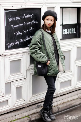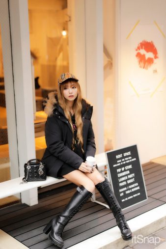 「冬ダウンのネクストブームブランドとして注目されている、PYRENEX(ピレネックス)のダウンが今季のお気に入りアウター。長く使えるしシンプル&スタイリッシュなデザインが魅力なんです。インナーのカラフルな“LIBERTY”のロゴが可愛いパーカは、お友達がやっているブランドのもの。それに、レースアップブーツ(EGOIST)を合わせてみました。小物はChristian DiorのチェーンバッグでハイブランドをMIX。仕上げにBURBERRYのチェック柄キャップをかぶってみたんです。」