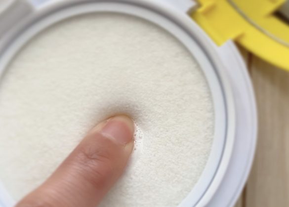 クッション部分にパフを優しく押し付けると、ジュワーっと液体がしみ出てきます。指で押してみるとよくわかりますね。商品名がウォーターパウダーなので、てっきりパウダーだと思っていたら違いました……。