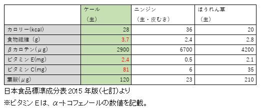 まずは、ケールがニンジン・ほうれん草などの緑黄色野菜と比べてどうなのか、というところを比較してみましょう。