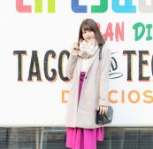 「ちょっぴりキレイめな着こなしになるように意識して、ベージュと白をメインにスタイリングしました! 丈が短めでバランスよく着られるムートンジャケット(SPIRALGIRL)は、裏地がもこもこなので暖かいんです。ボトムは流行りのプリーツロングスカート(Mimi Minette)を合わせて、縦のラインを強調して脚が長く見えるように。そして、少しだけ脚を見せてヌケ感を出しつつ、細見えするショートブーツ(DIANA)をIN。バッグはCELINE定番のラゲージを持ってみました!」