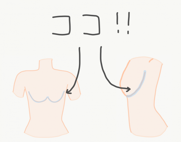 ワイヤーの丸みの頂点の部分です。肋骨が前に出ている体型の方はこの部分に当たりやすかったり、試着の段階では良くてもつけているうちに痛くなったりする方もいるので、ワイヤーの当たりの説明をするときに便利です。