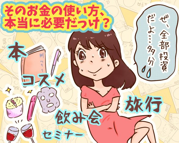 よくあるのが、自己投資風の消費だそう。自己投資だからムダ使いではなく「投資」かと思いきや、「買ったものの読まない本」「参加して終わりのセミナー」「愚痴を言い合って終わりの仕事の飲み会」など活用が甘いものは、参加や買ったことで満足しており投資とはいえません。