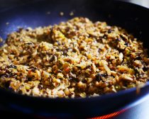そしてきのこをドバっと投入。ここでもきのこは水分量の多い食材ですから、火加減を弱めることなく、香ばしく焼き炒めていきましょう。