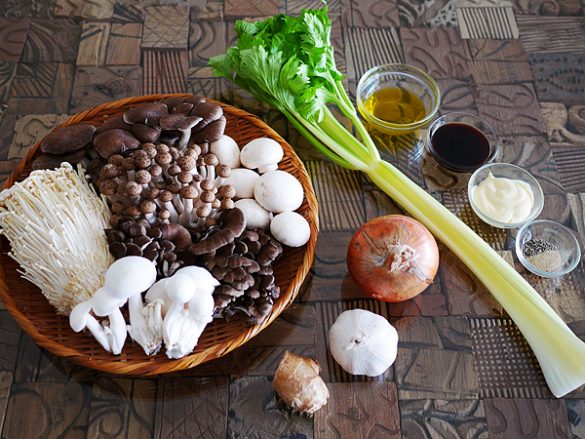 用意するのは、きのこ(たっぷり)、玉ねぎ(1個)、セロリ(1本)、生姜(1片)、にんにく(1片)。セロリが面倒なら、玉ねぎを2個にすればOKです。味付けは、オイスターソース(大さじ5)、マヨネーズ(大さじ5)のみ。あとはオリーブオイルとこしょうを揃えておきましょう。