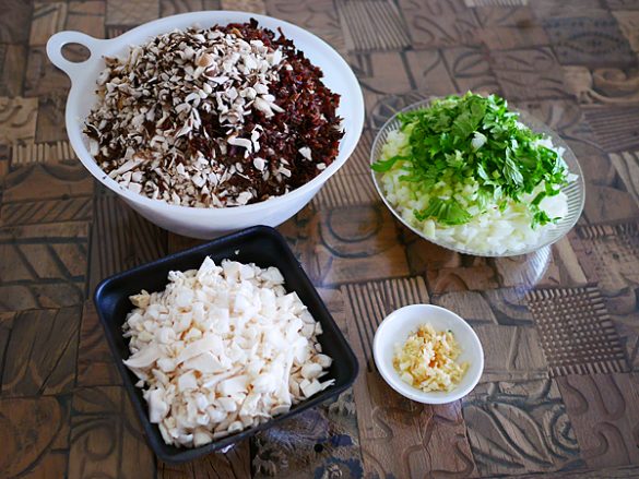 (1)きのこ、玉ねぎ、セロリ、生姜、にんにくを刻む