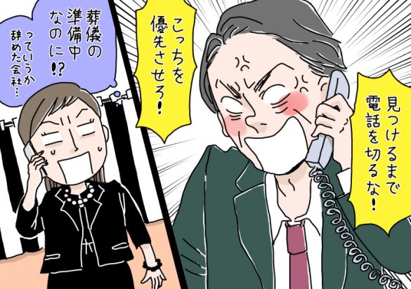 「電話をすると、第一声が怒鳴り声で『遅い! さっさと電話してこい!』ですからね。このときも仕事に必要な資料の場所を聞かれたので、入っているパソコンのフォルダ名を教えました。すると、ここで葬儀屋さんに呼ばれたので電話を切ろうとしましたが、『ファイルを見つけるまで電話を切るな!』って言い出したんです」