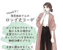 身長が低いからロング丈のアイテムが全てNGということはありません。大事なのは、全身のバランスが整っていること。余計に太って見えたり、寸胴に見えたりしないか注意深く、鏡でチェックしておくと良いですね。