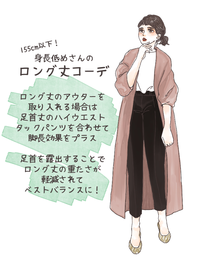 しかし、このトレンドに困っているのが、身長が低めの方。トレンドの着こなしを楽しみたいものの、ロング丈アイテムの着こなしを間違えると途端に野暮ったくなってしまいます。そこで今回は、身長が155cm以下の方のためのロング丈コーディネートテクニックをご紹介いたします。