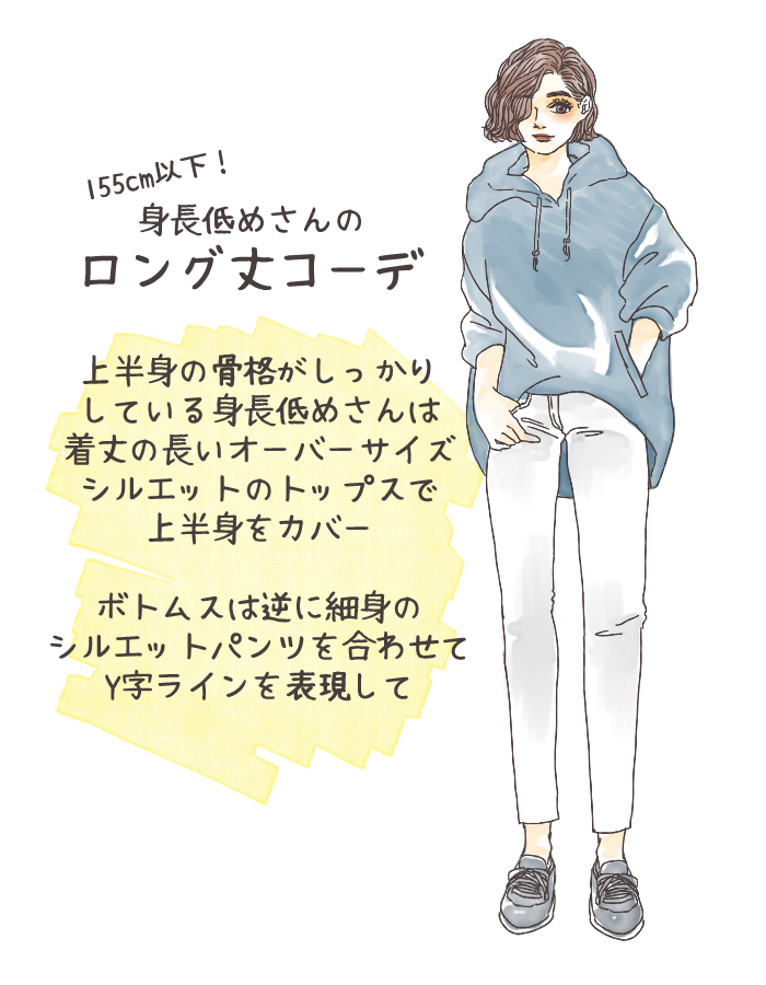 身長が低いことにプラスして、「バストが大きい」「肩幅が広い」「顔が大きい」という特徴がある方は、上半身はゆったりしたオーバーサイズシルエットのロング丈トップスを、ボトムスは逆にタイトでコンパクトなシルエットの「Y字ラインコーデ」を意識的に取り入れましょう。