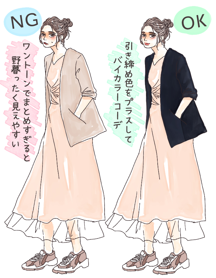 ベージュの柔らかな印象をそのままに、程よく引き締まった印象を与えるので野暮ったくなりにくいのがポイントです。インナーはベージュのワンピースに、ロングカーディガンにネイビーのアイテムを取り入れるなどでメリハリを作ってみましょう。