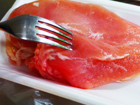 最初にお伝えすべきは、作り方は超簡単であること。炊飯器を汚すこともありません。準備としては、鶏むね肉を用意して、味が染み込みやすいよう、フォークなどで穴をあけること。