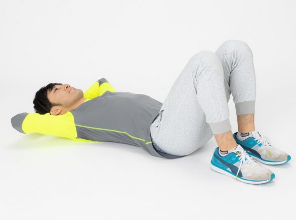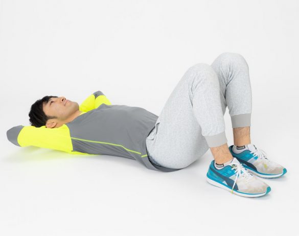 1. 仰向けに寝て、腹圧を高めるためにお腹を固くする。