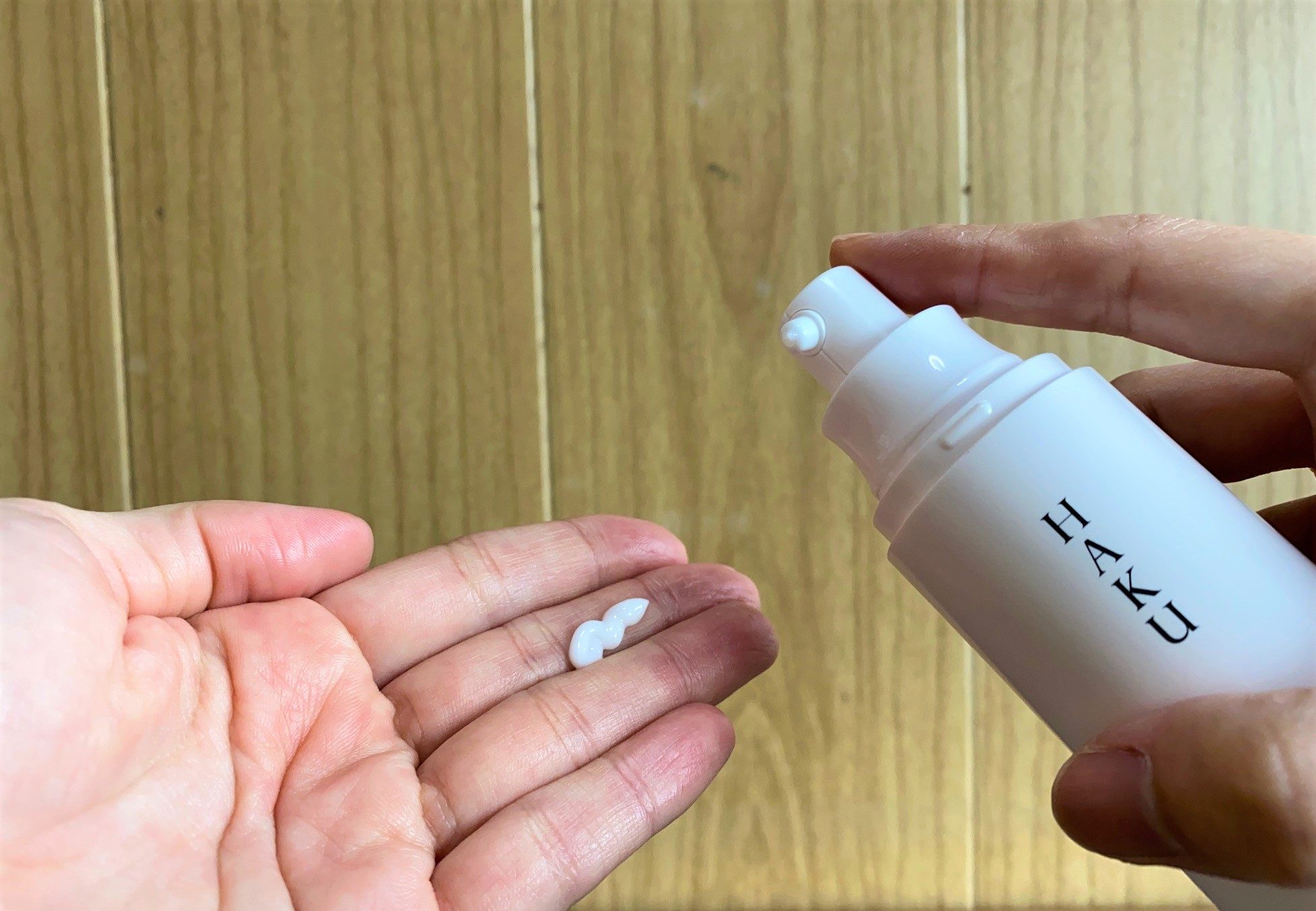 朝・晩の化粧水後の肌に2プッシュ。最初は量の多さに驚きましたけど、でもこのたっぷりの量で顔全体にしっかりと行き届くんですよね。