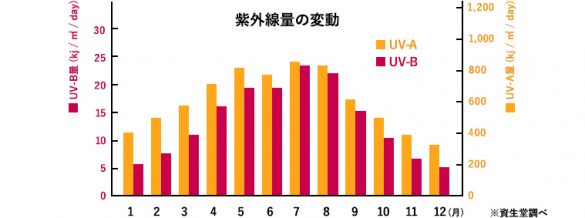 レジャー紫外線と言われるUVBなんて、4~9月がピーク! 完全に油断していました。ちなみに夏~秋もアウトドア派な筆者ですから、一年のほとんどの時期が紫外線リスクにさらされることになるというわけです。